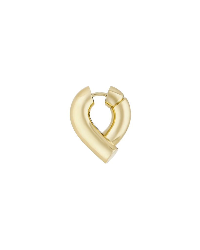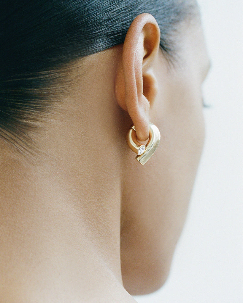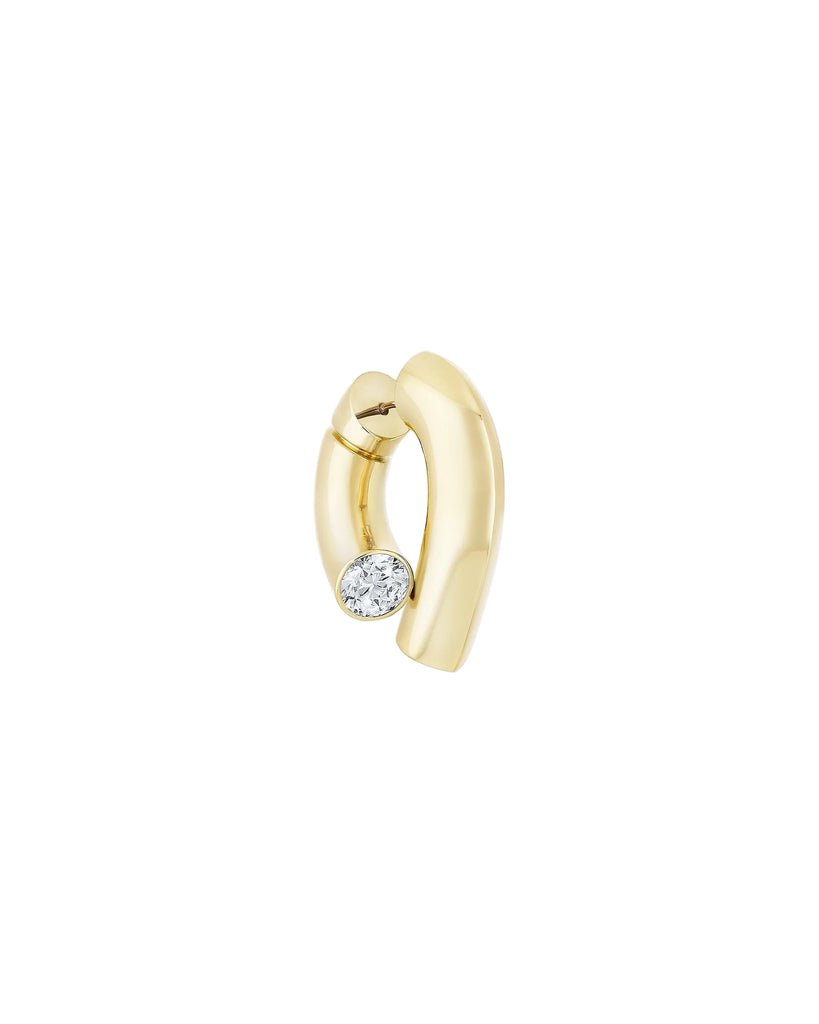 The Oera Earrings feature 18k yellow gold tubing intersecting with a single diamond end, and are finished with hinge click closures. Inspired by Ianna's Knot, the ancient Mesopotamian symbol of fertility and protection, the Oera Collection is the brand's first. Sold as a pair.