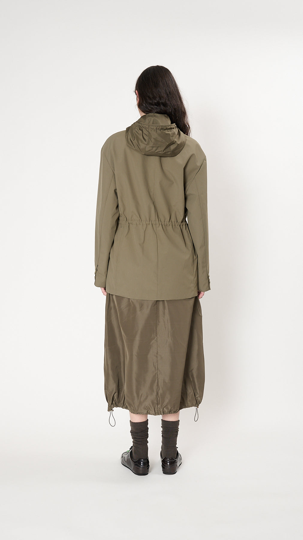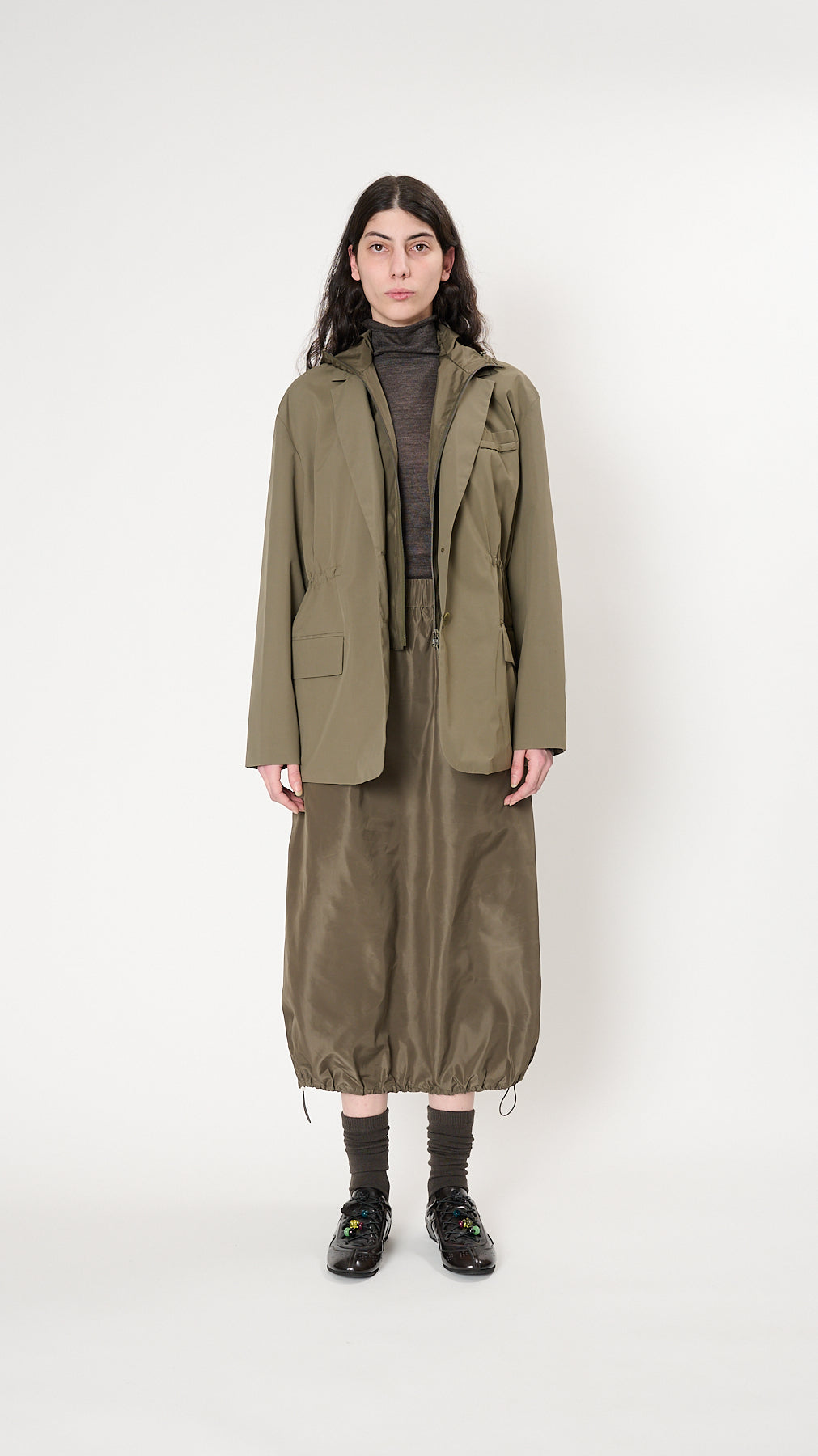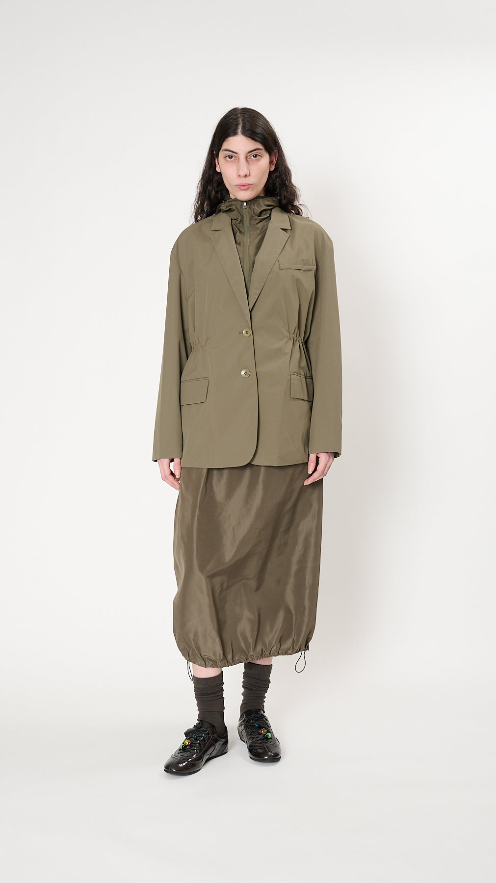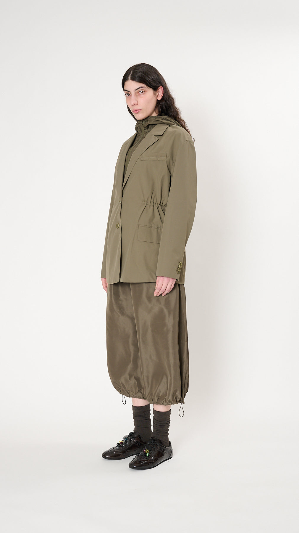 The Tibi Anorak Blazer has a refined tailoring with an adjustable silhouette made from a practical waterproof bonded nylon. It features a classic notched lapel, detachable hood, a two-button front closure, a single welt chest pocket, flap front hip pockets, and adjustable waist cords.