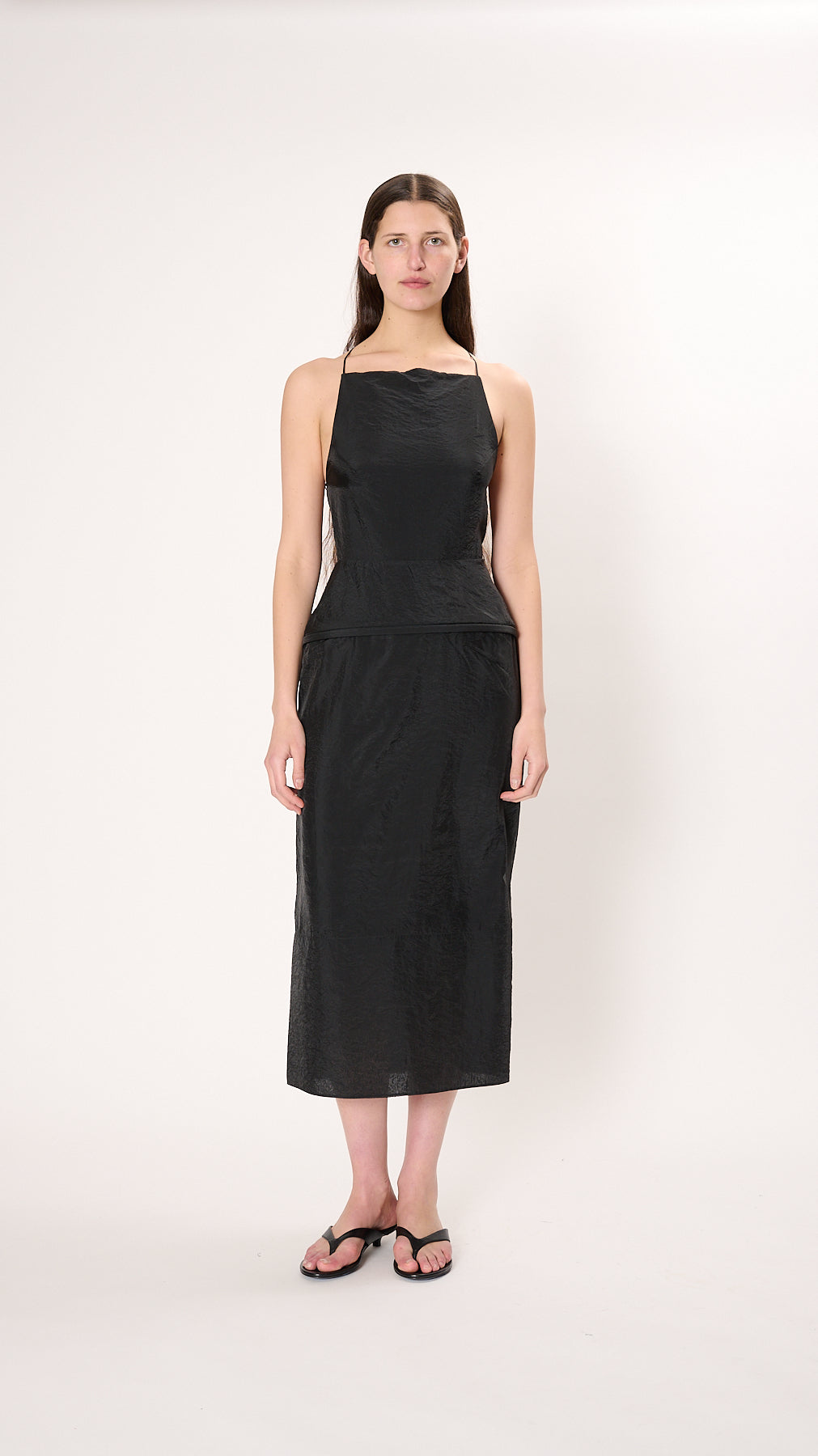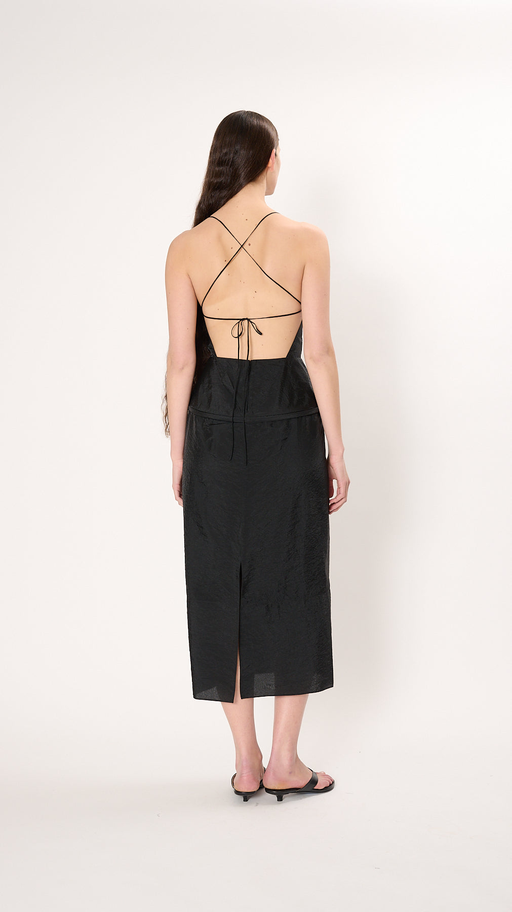 The Chassis Hoop Strappy Dress has a straight silhouette with a unique built-in hoop at the hips giving it dimension. Made from a sheen, wrinkle-resistant fabric, it features a square neckline, open back with self-tie strap, and back zip closure.