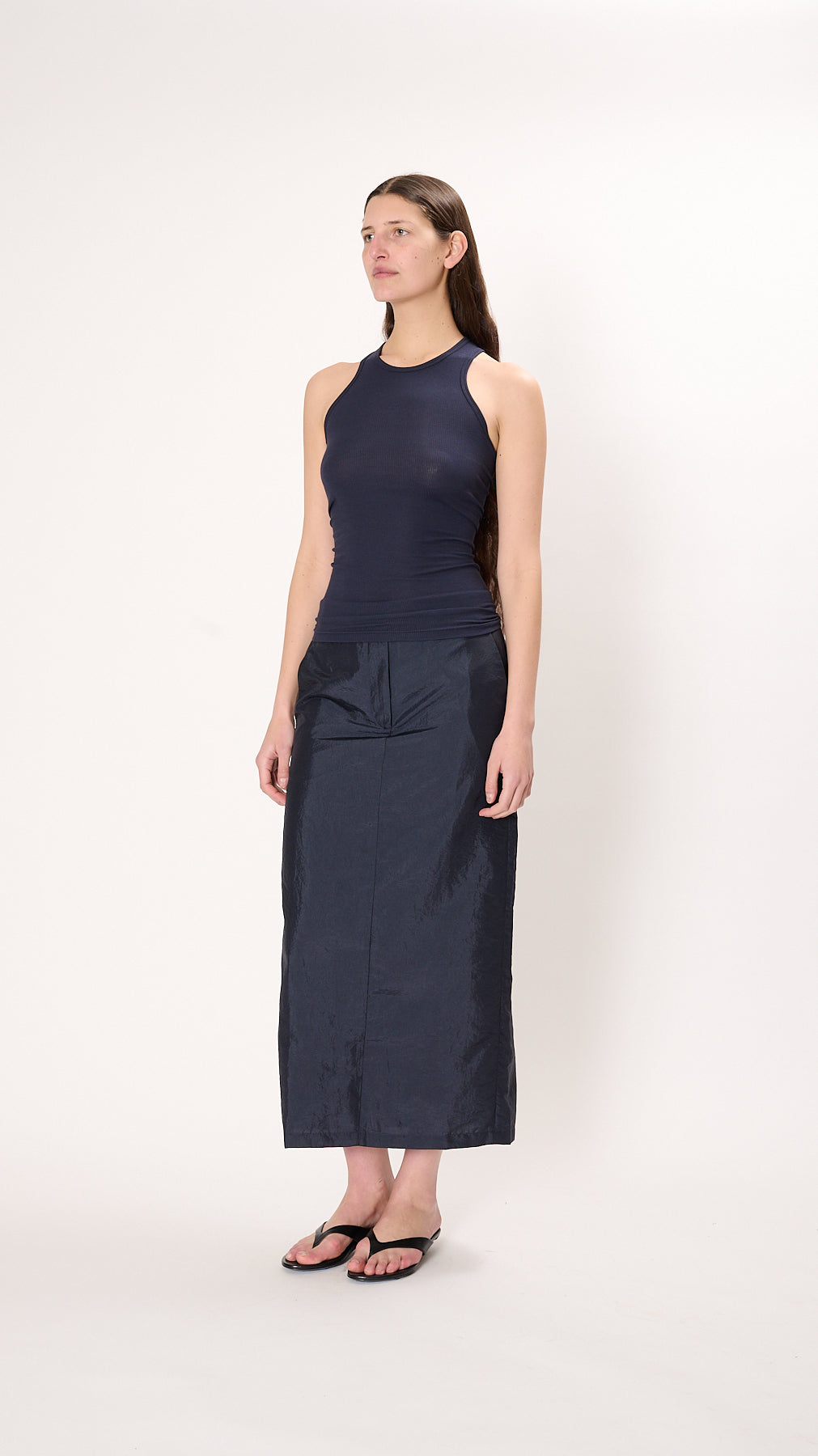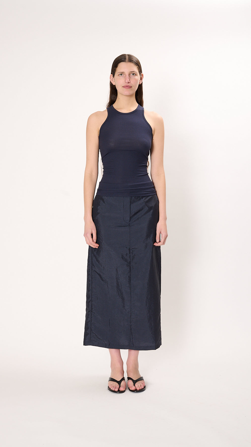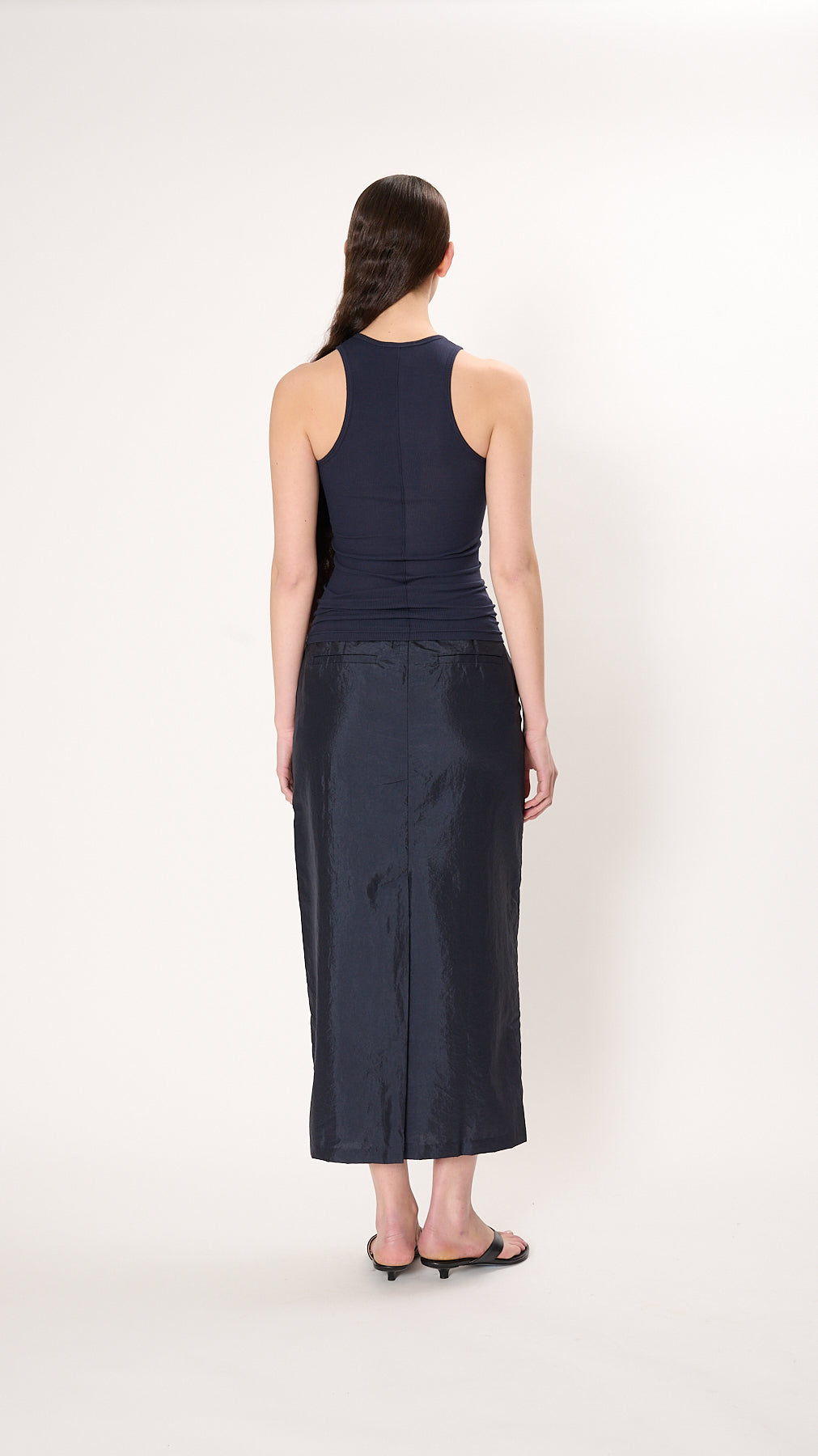 The Circular Fine Rib T Tank has a fitted silhouette made from a 2x1 Peruvian cotton. A classic layer piece and wardrobe staple, it features a subtle scoop neck and racer back.