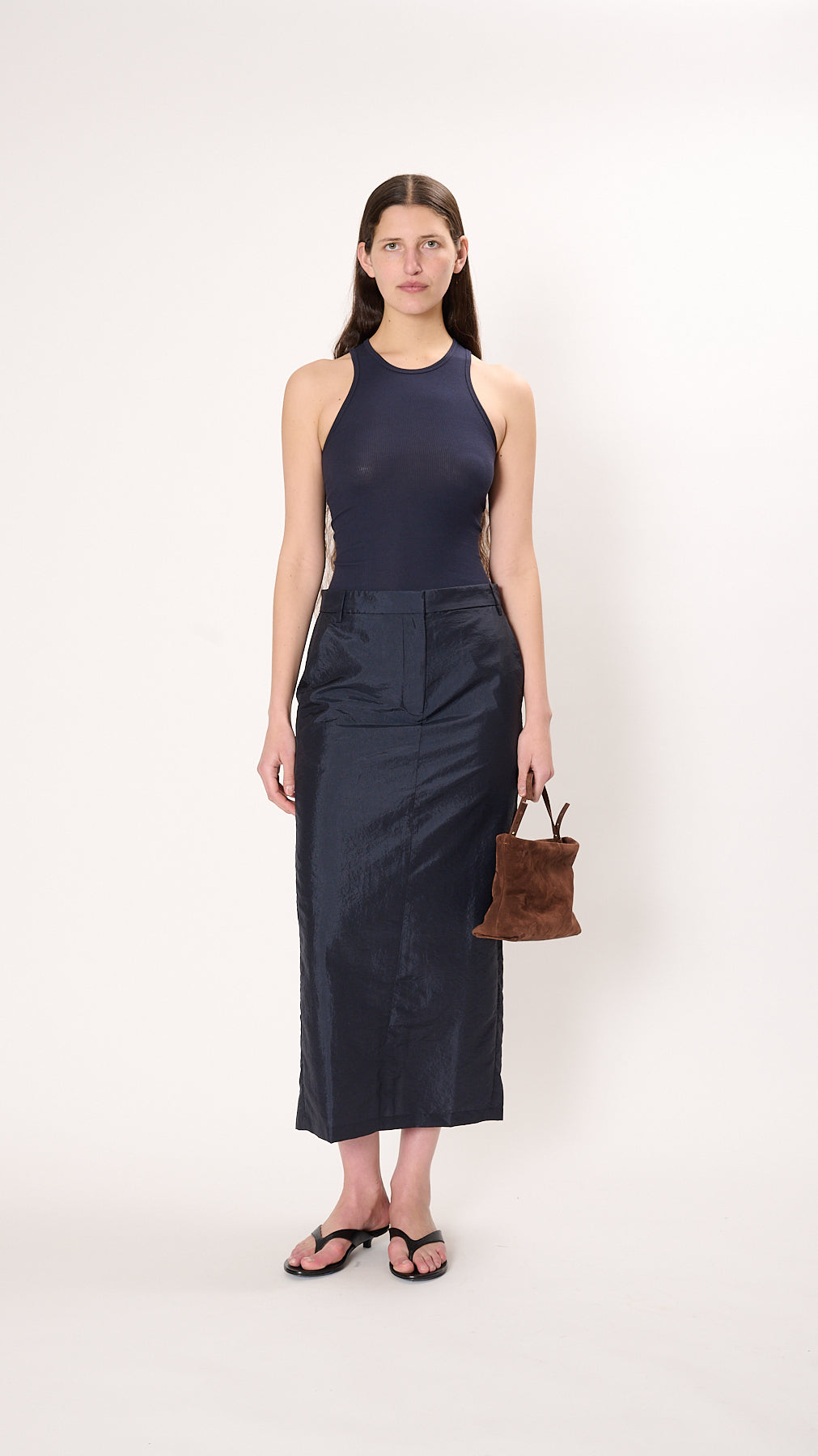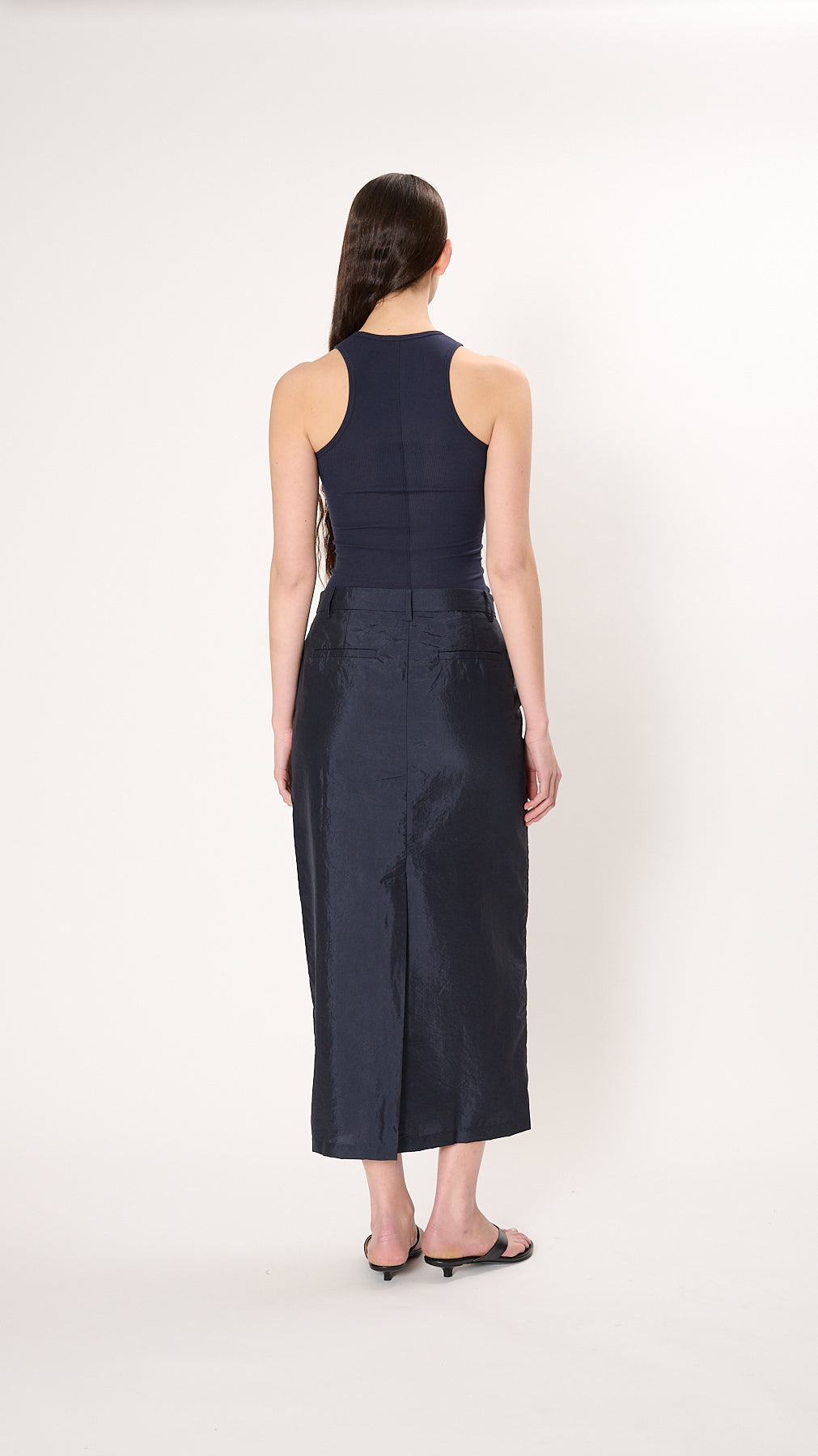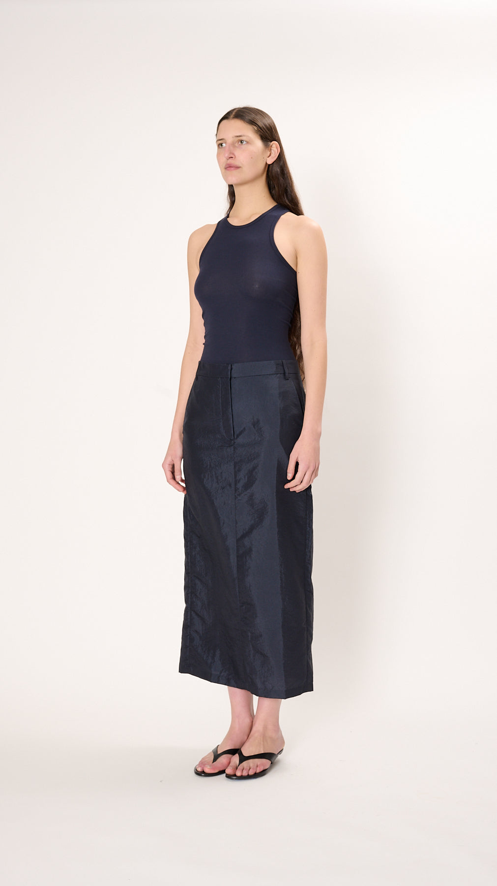 The Crispy Nylon Maxi Skirt has a straight silhouette made from lightweight nylon suiting. It features a button and zip fly, belt loops, side seam pockets, back welt pockets, and a back hem vent.