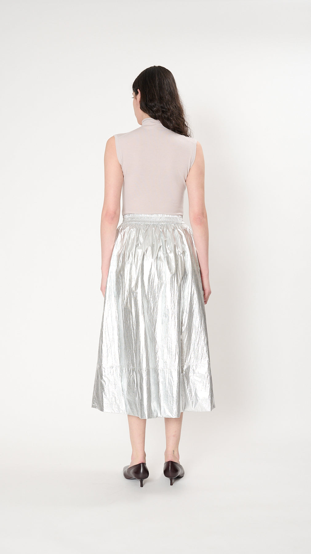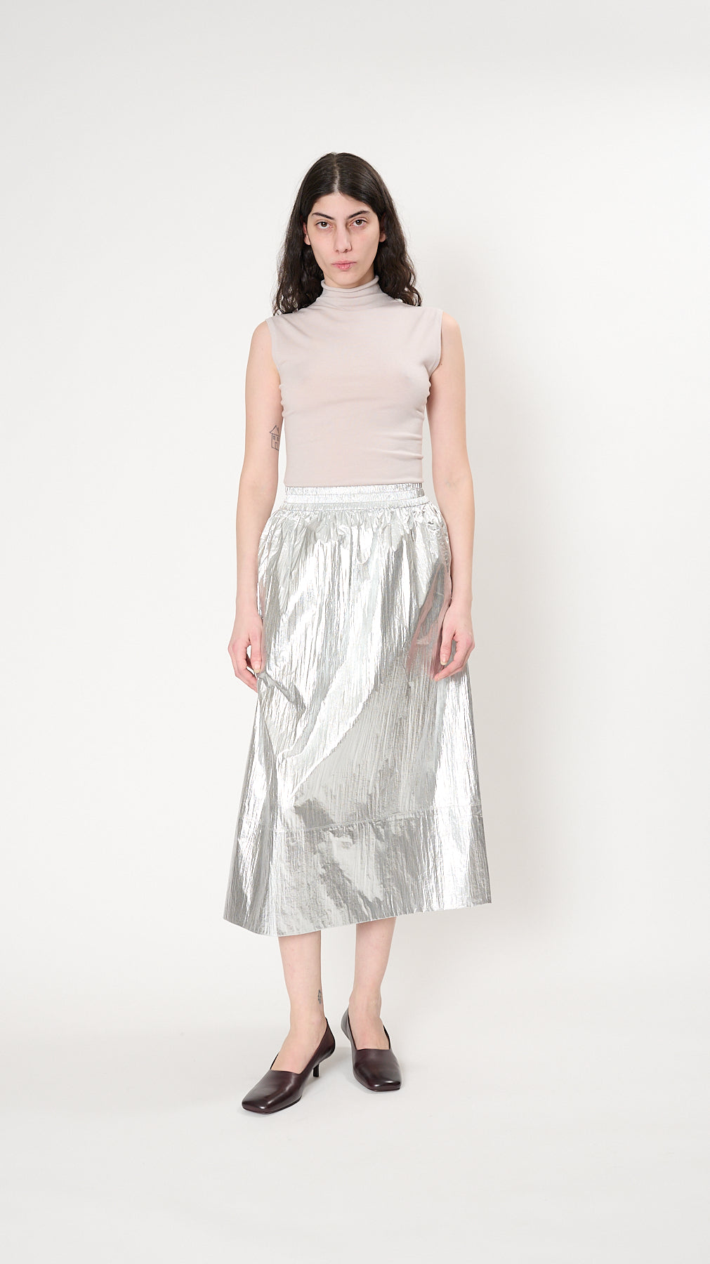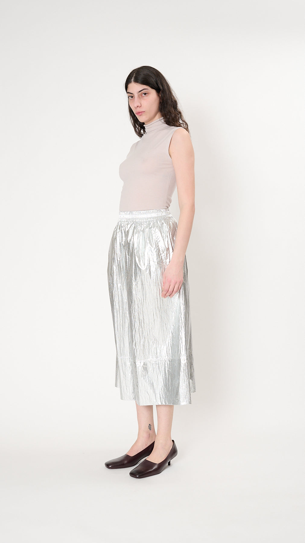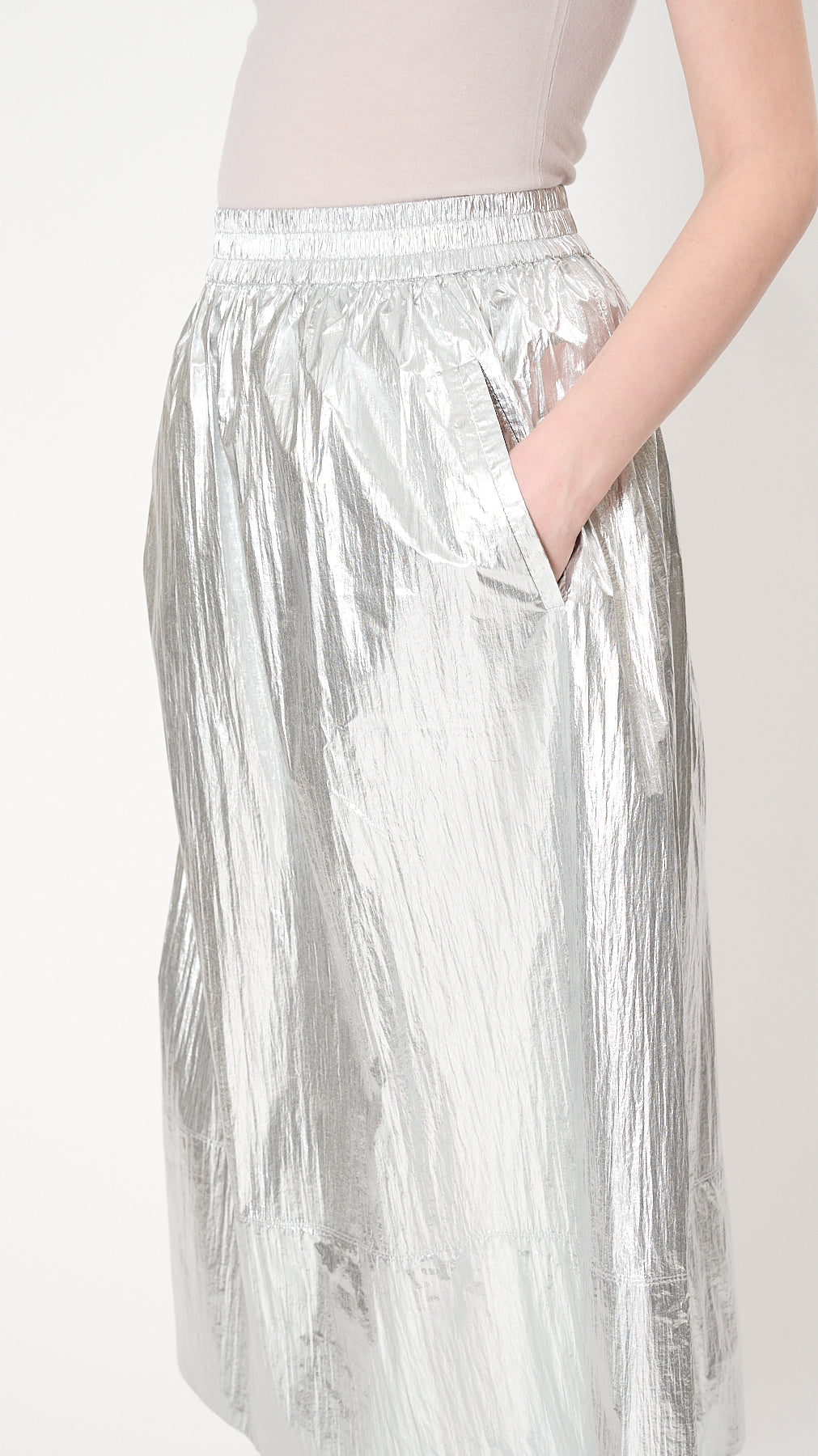The Metallic Pull-on Full Skirt has a relaxed, voluminous silhouette made from lightweight nylon with a silver foil finish. It features an elasticated waistband, functional side pockets, and a fluid, gentle drape.