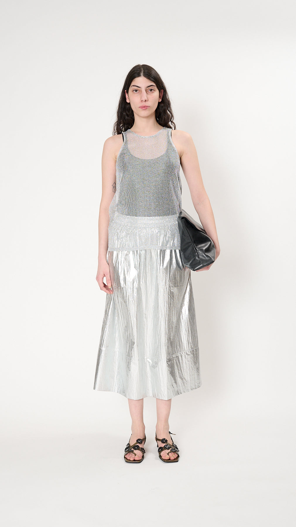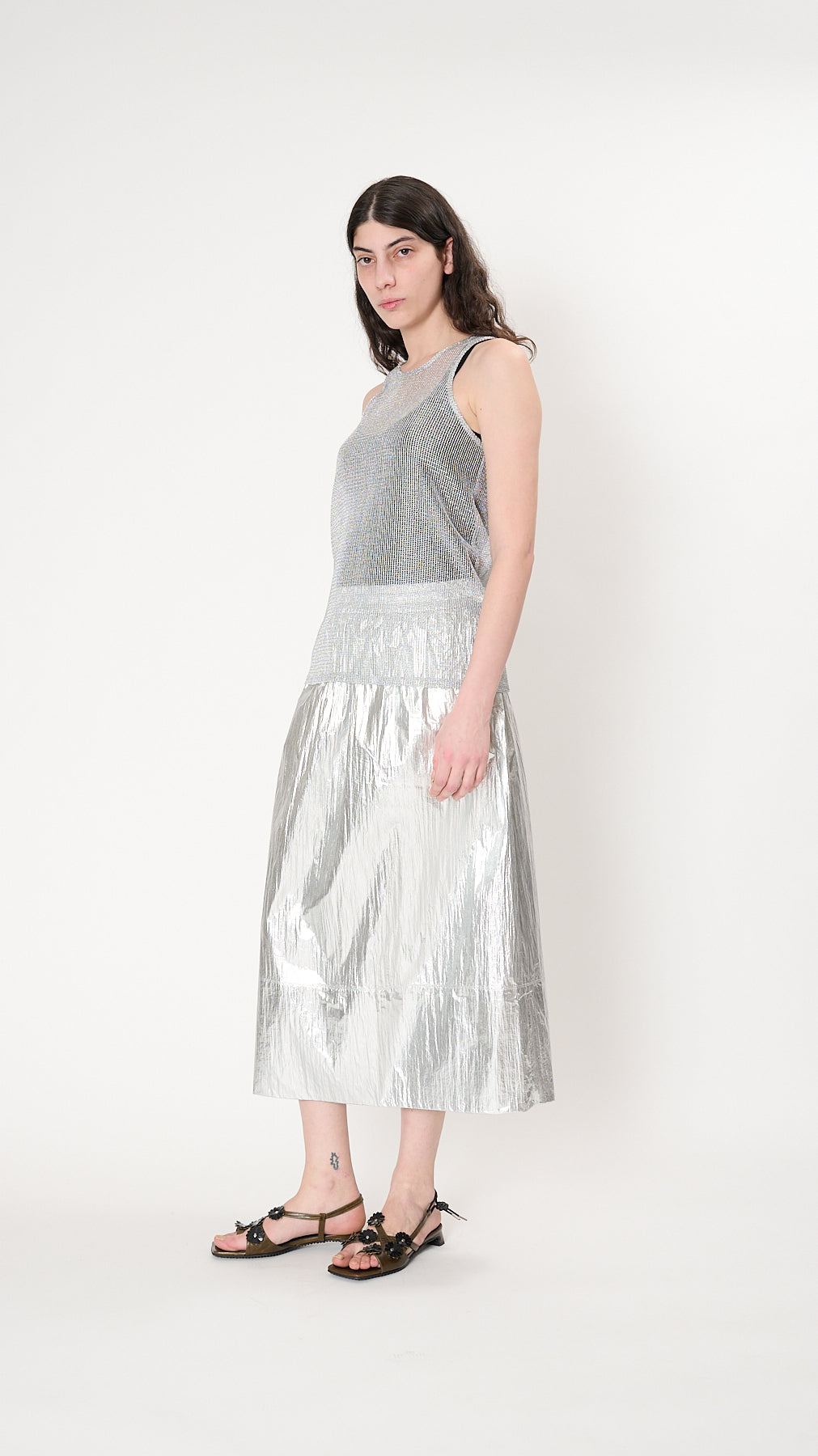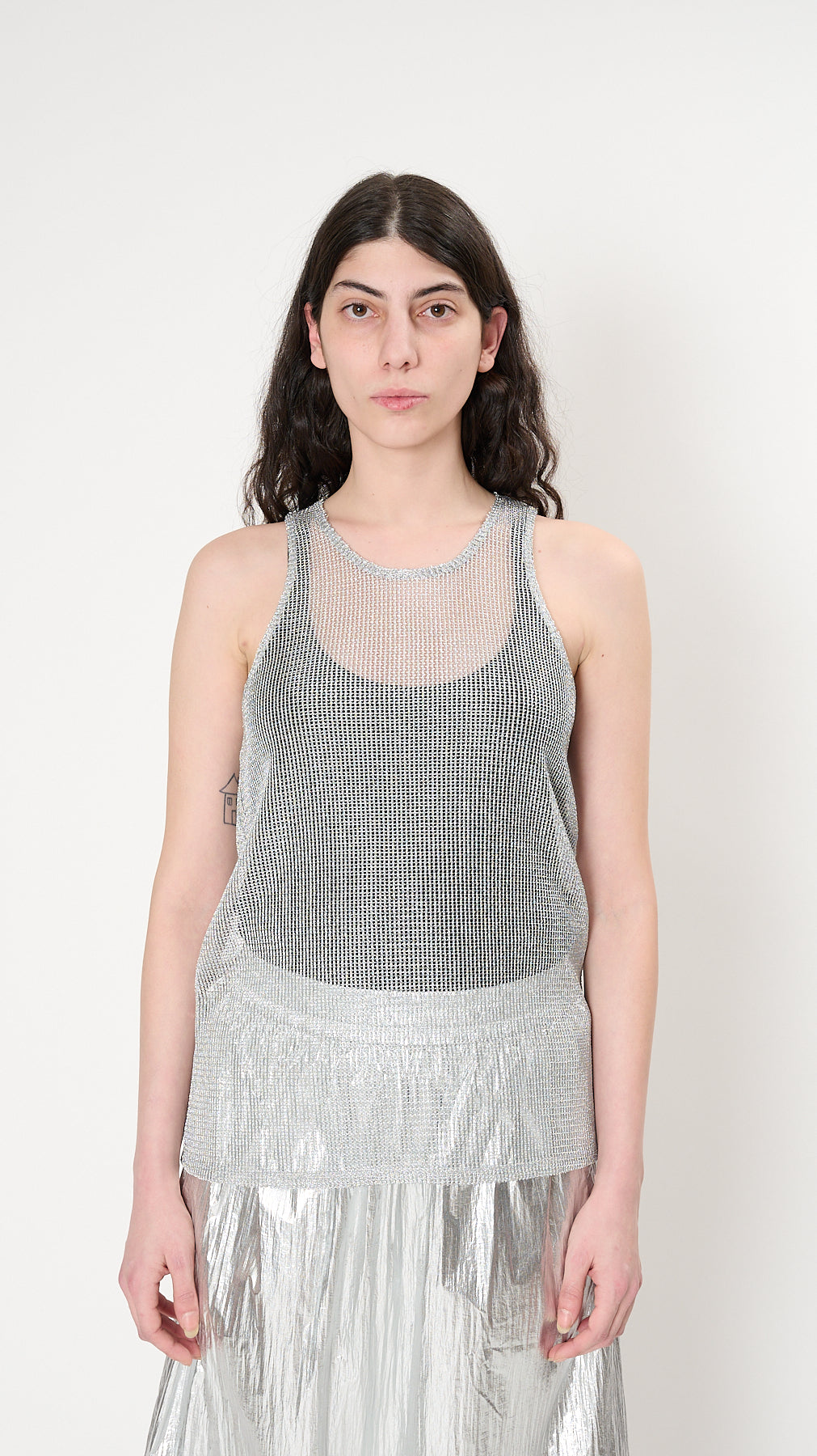 The Metallic Ribbed Tank has a relaxed, elongated silhouette made from a loose Italian metallic ribbed yarn with a silver foil finish. It features a scoop neck, racer back, and a fluid, gentle drape.