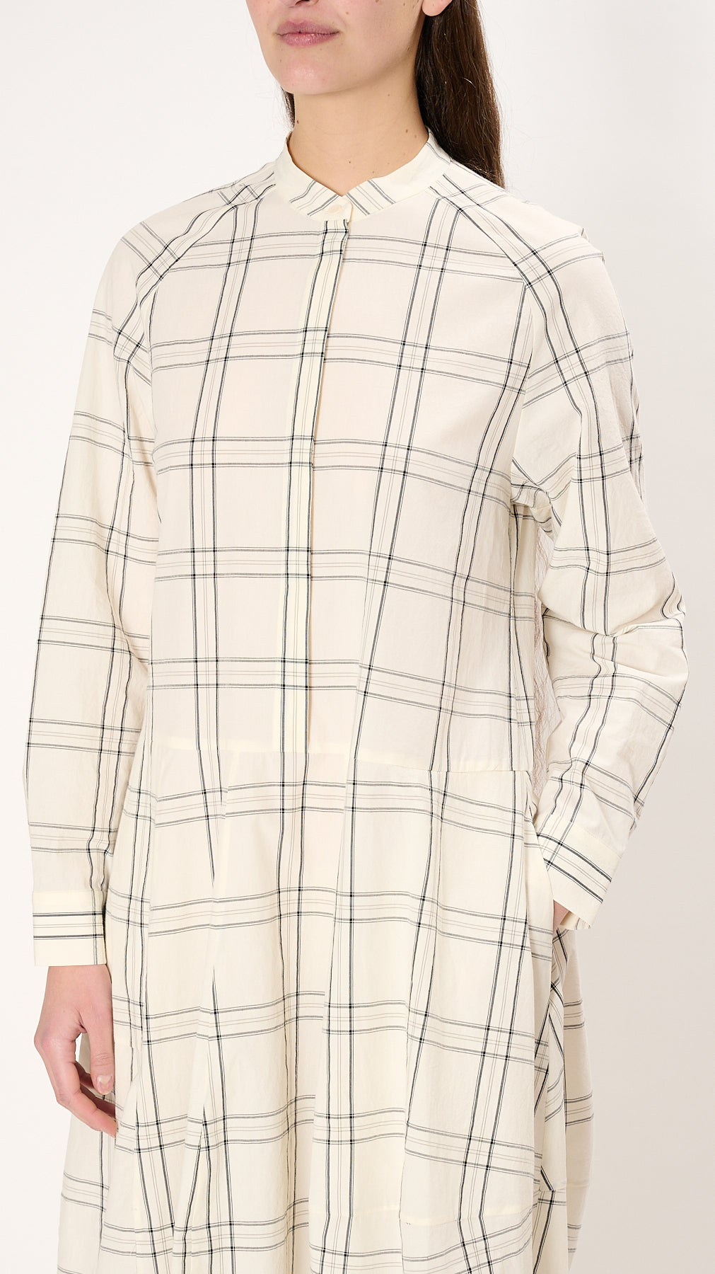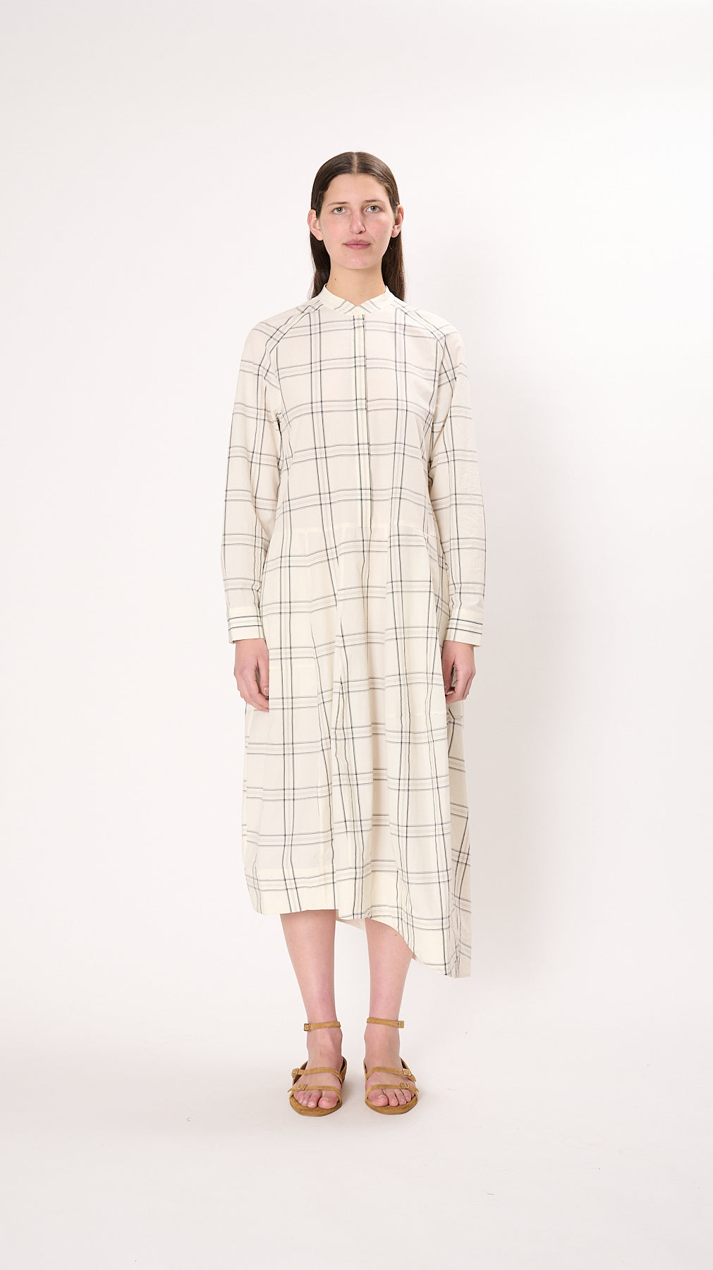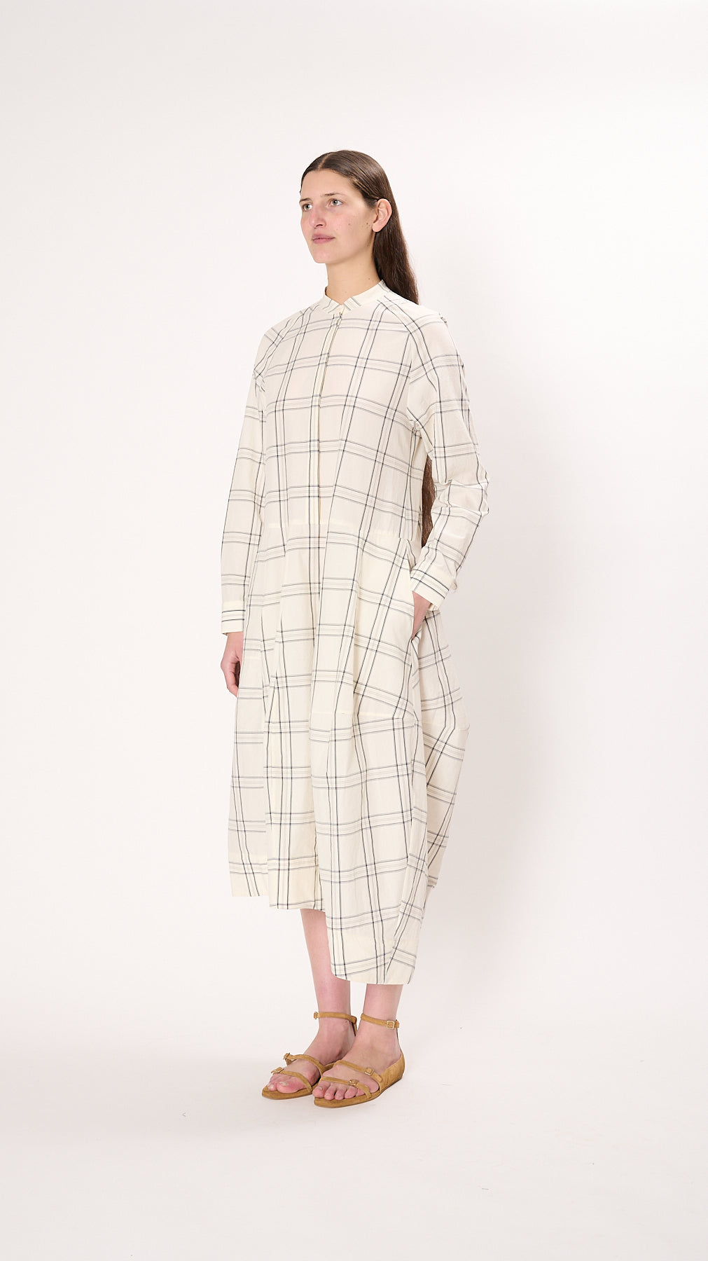 The Russel Plaid Balloon Dress has a long sleeve, oversized silhouette made of a lightweight plaid cotton. It features a small band collar, button half placket, voluminous barrel skirt with asymmetrical hem, and side seam pockets.