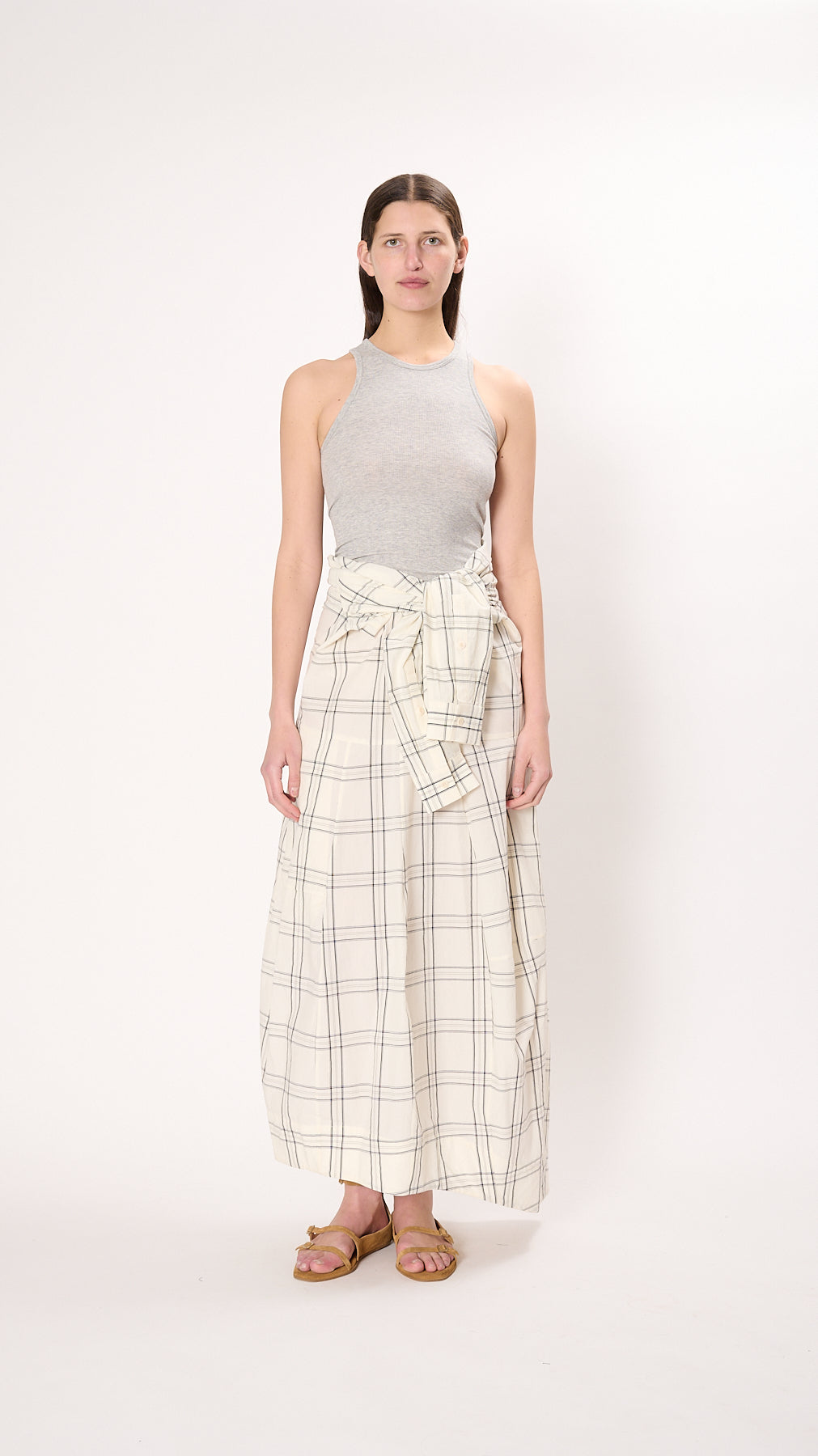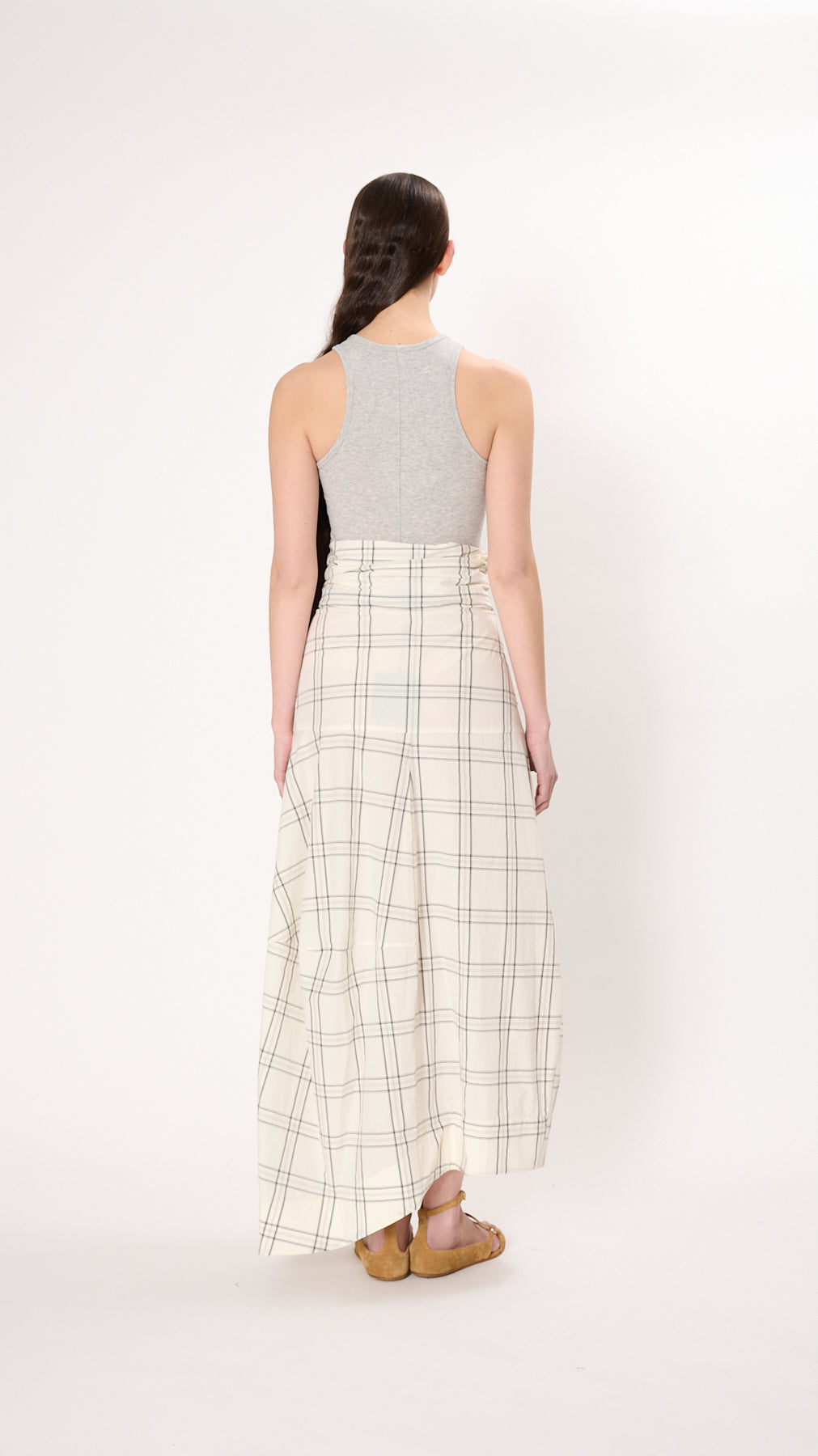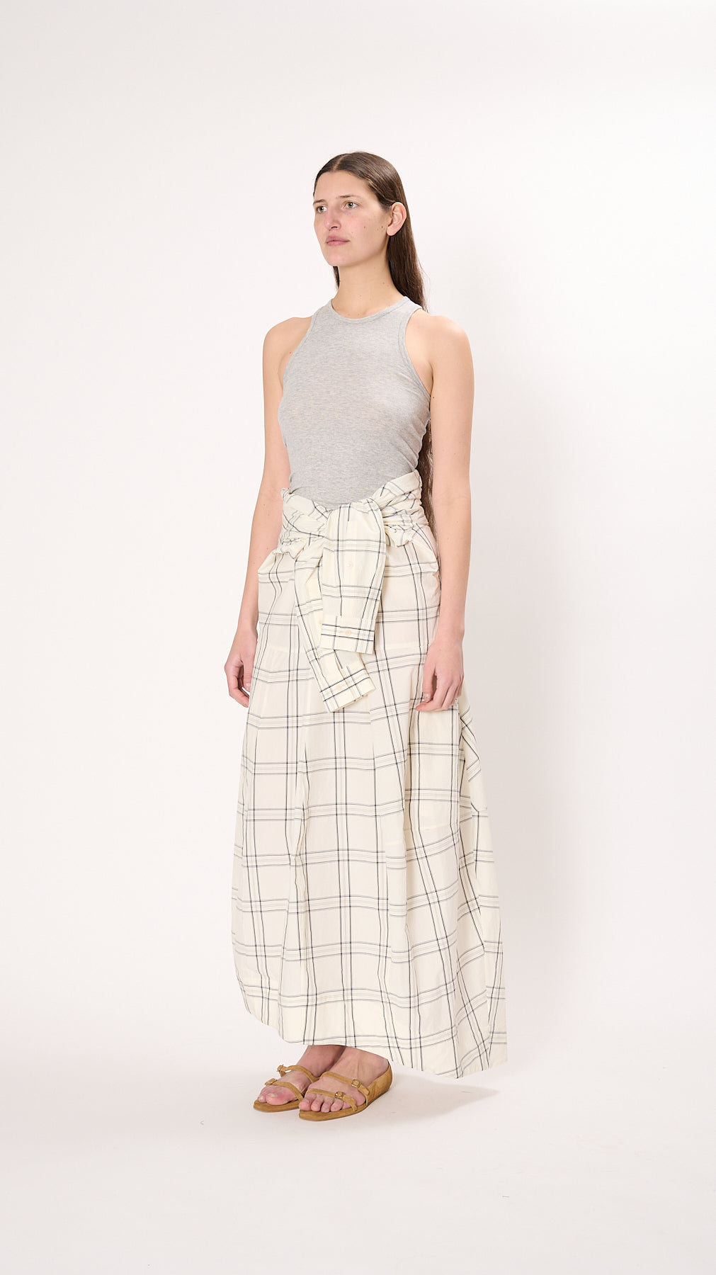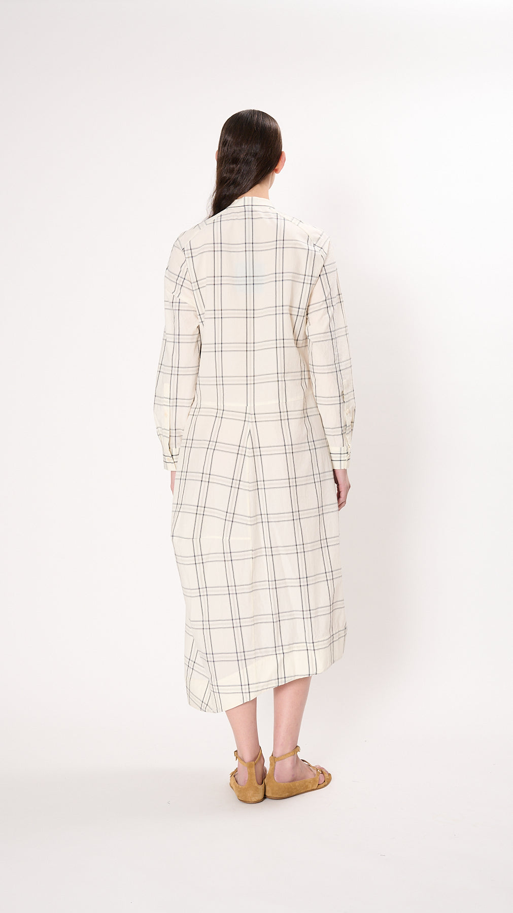 The Russel Plaid Balloon Dress has a long sleeve, oversized silhouette made of a lightweight plaid cotton. It features a small band collar, button half placket, voluminous barrel skirt with asymmetrical hem, and side seam pockets.