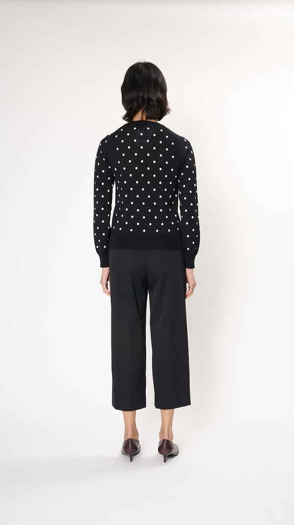 The Polka Dot Cardigan has a fitted silhouette made of fine wool. It features a crewneck, button front, and ribbed cuffs and hem.