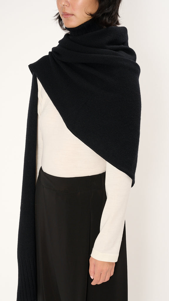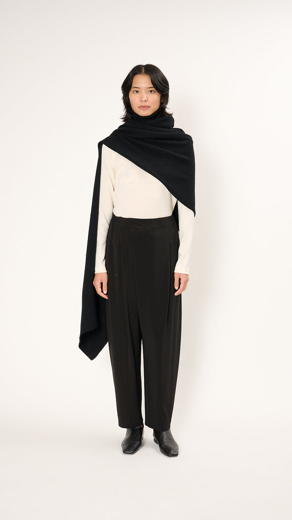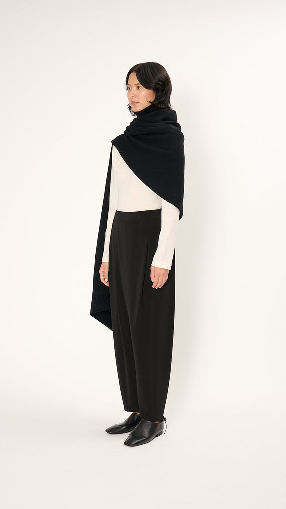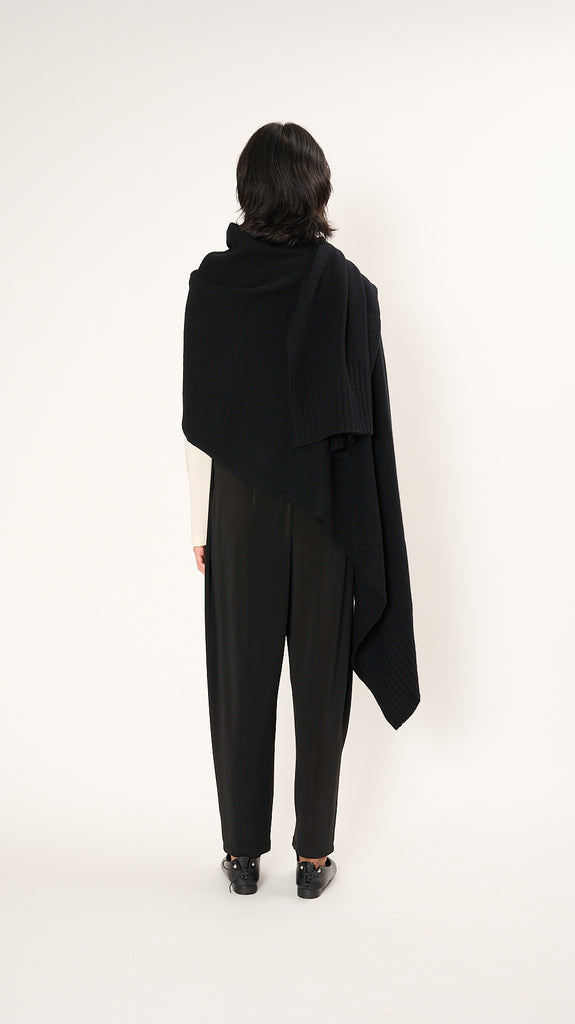 The Crooked Wool Knit Cape has a relaxed, draped silhouette that can also be worn as a stole. Made from spongy, slightly thick worsted wool, it offers warmth and a soft, comfortable feel.