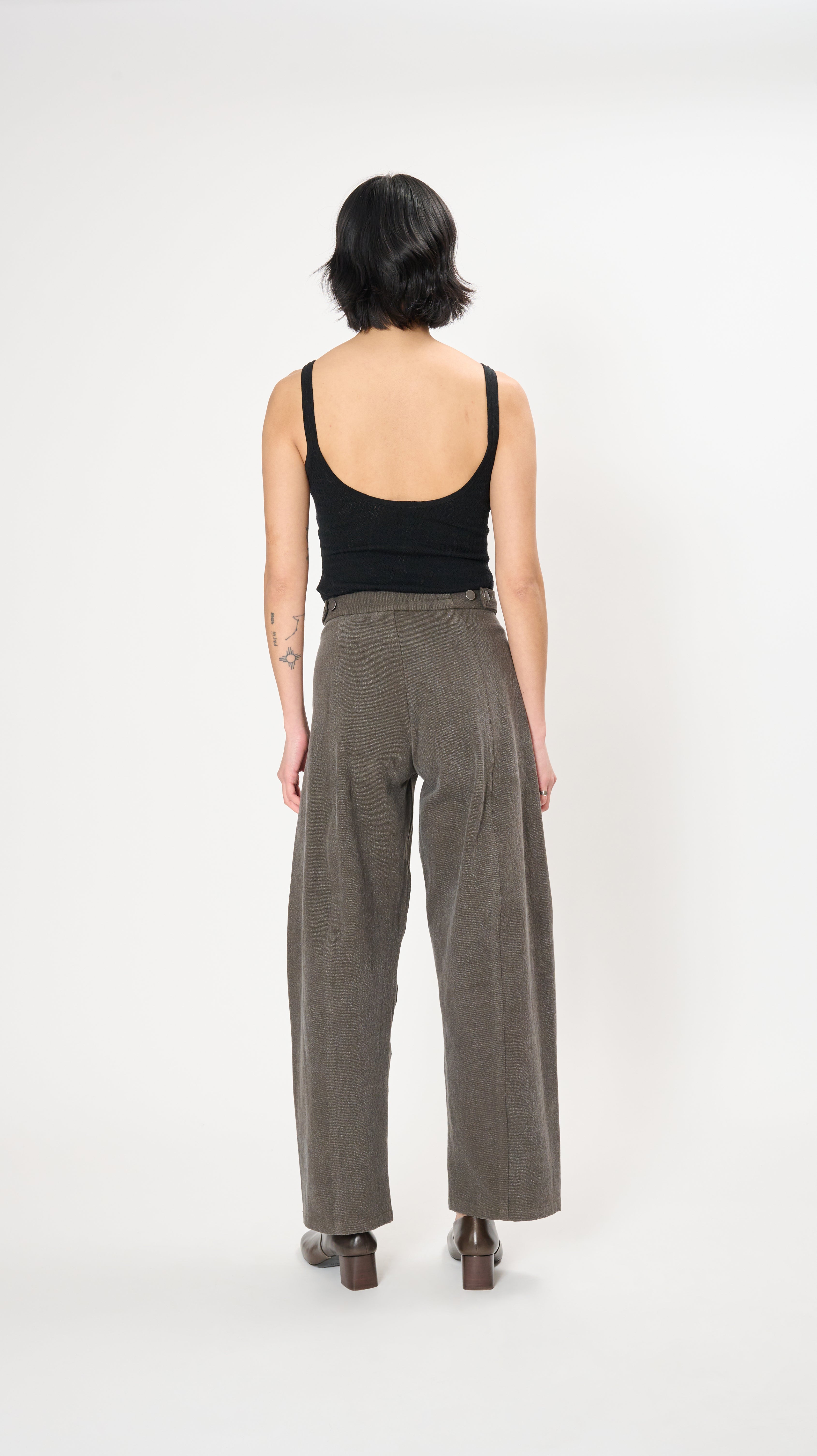 The Twill Pants have a straight-leg, structured silhouette made of cotton twill. They feature a zip and button fly, side seam pockets, a back elastic waist, and adjustable waist tabs.